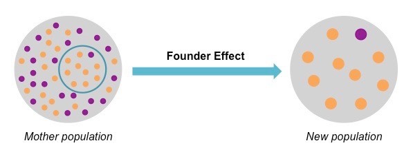 The founder effect occurs when a small population breaks apart from a larger population colonising new land - more genetic dirft (more diverse the small group) - as it grows no longer representation of original population
