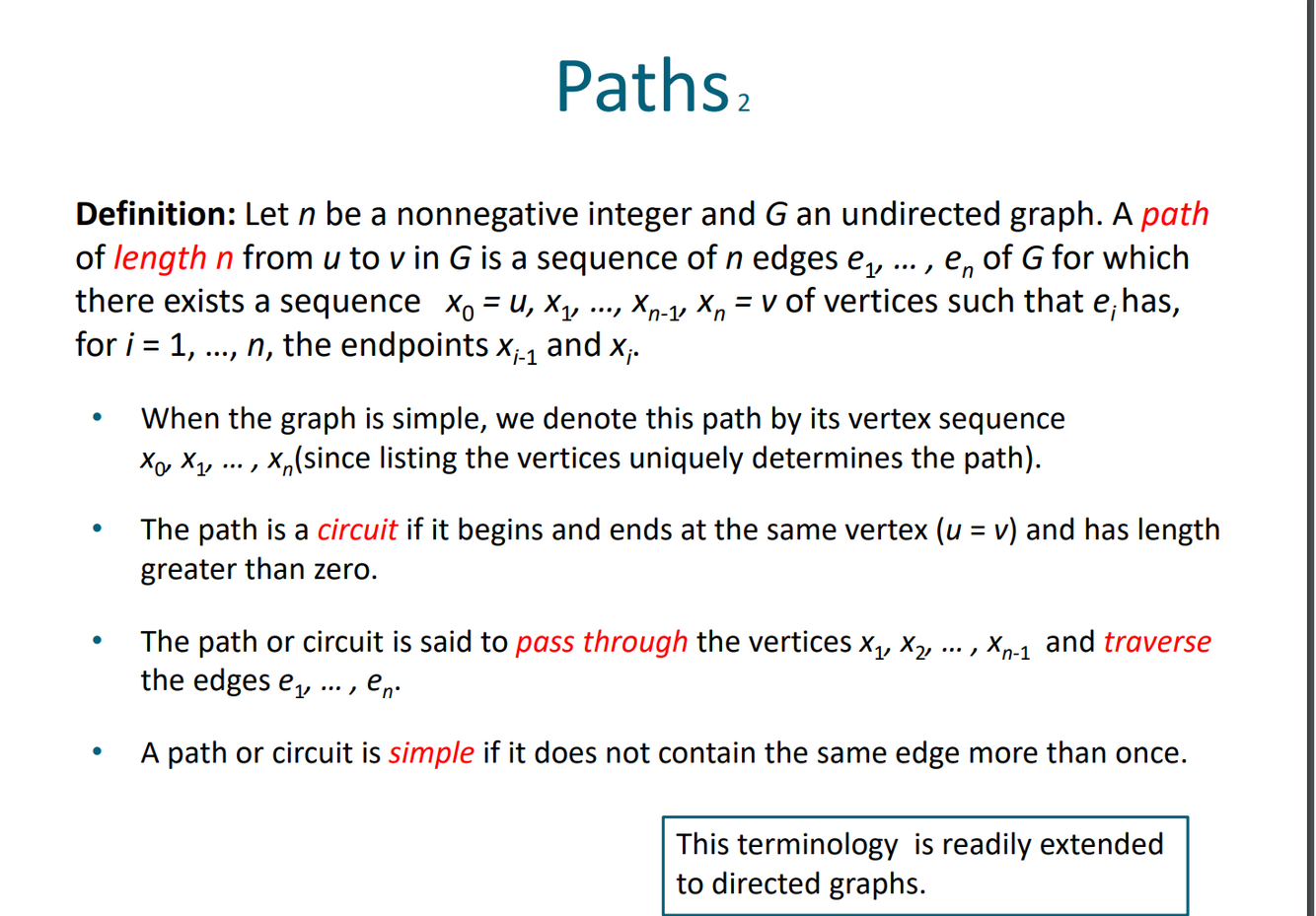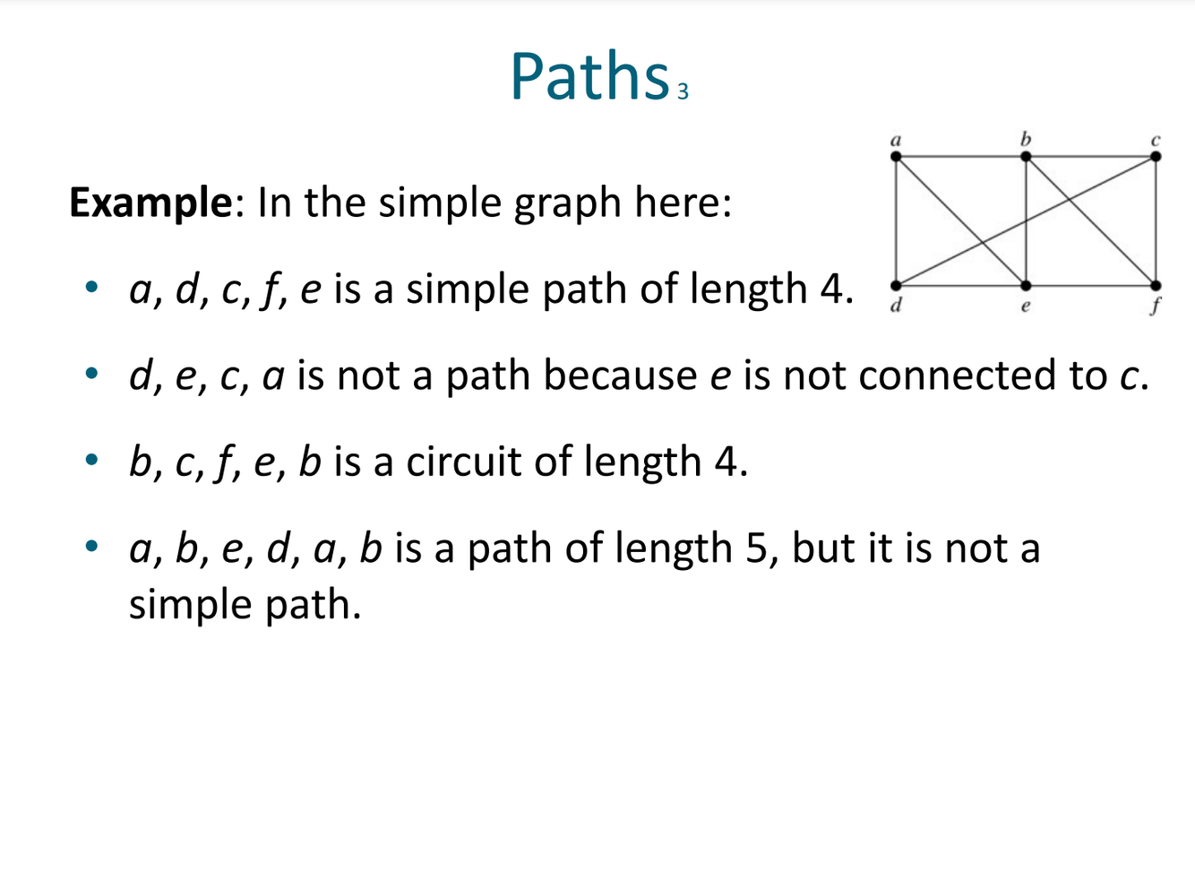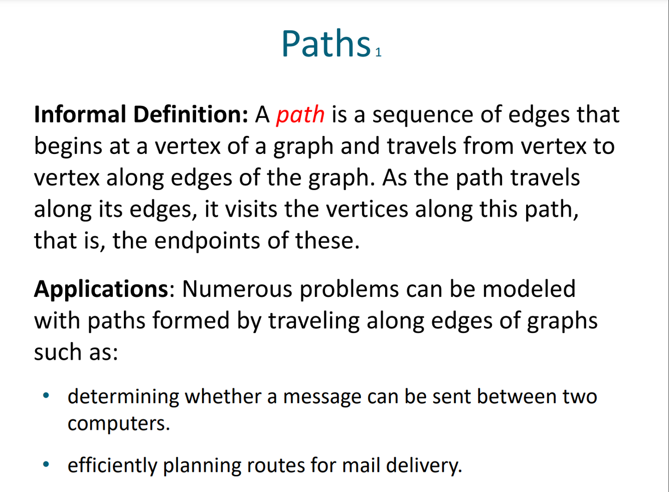 Informally, a path is a sequence of edges that begins at a vertex of a graph and travels from vertex to vertex along edges of the graph. As the path travels along its edges, it visits the vertices along this path, that is, the endpoints of these edges.