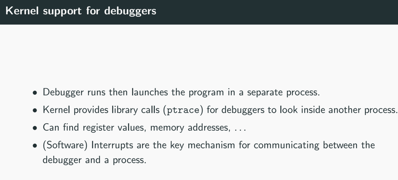 • Kernel has library calls (such as ptrace) for debuggers
