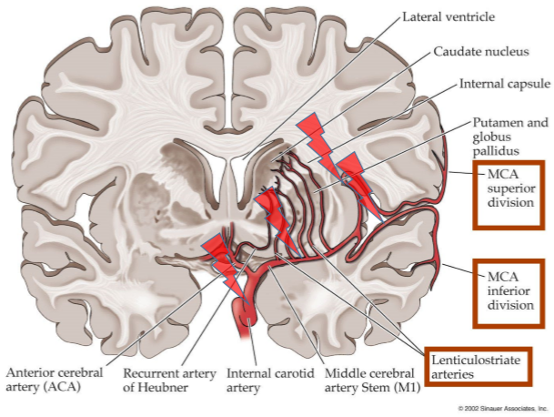 Lacunar stroke means lenticulostriate artery/arteries are affected. LS arteries supply internal capsule, lentiform nuclues and caudate nucleus. Since there are numerous lenticulostriate arteries you can have different types of lacunar strokes: