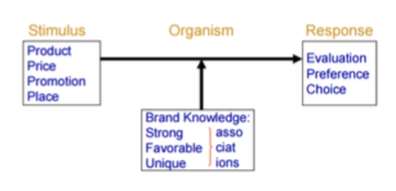 Het kennen van een merk leidt tot andere reacties (CBBE) >> Y = response (bijv. evaluatie of keuze), X = stimulus (activiteit die door de organisatie is ontworpen, bijv. prijs). Brand knowledge is een moderator in deze relatie >> verandert de slope.