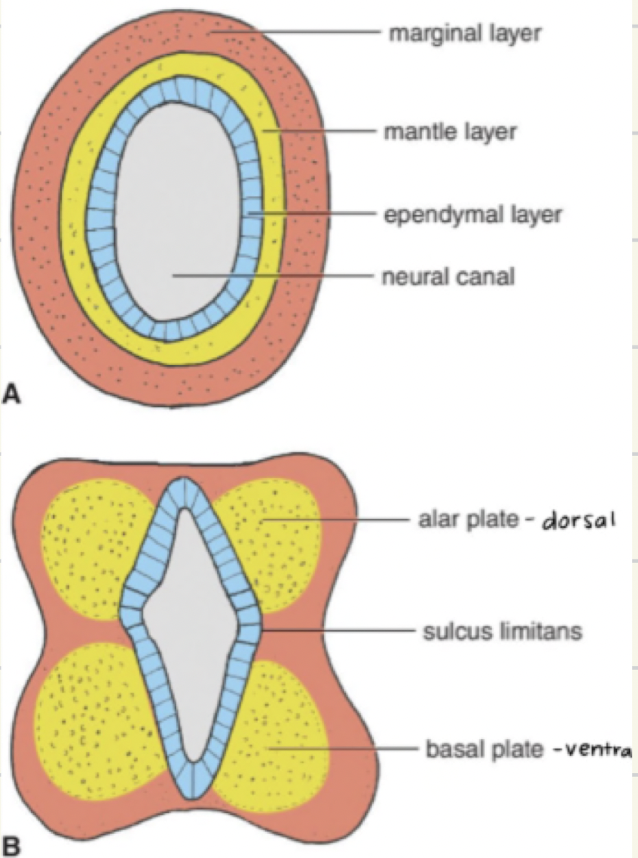 Alar plate becomes dorsal horn (sensory).