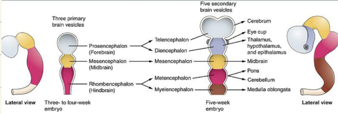 Develops at the cranial end of the neural tube with 3 divisions.