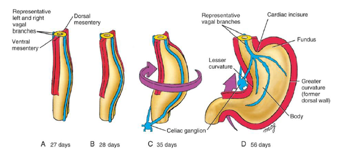 הראשון, הקיר האחורי של הקיבה גדל יותר מהקיר הקדמי, מה שגורם לקיבה להתעקם