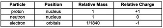 State the position, Relative Mass and Relative Charge of a proton, neutron and electron.