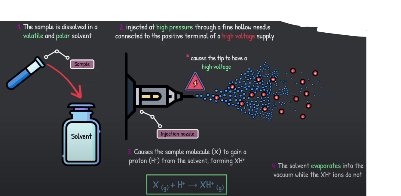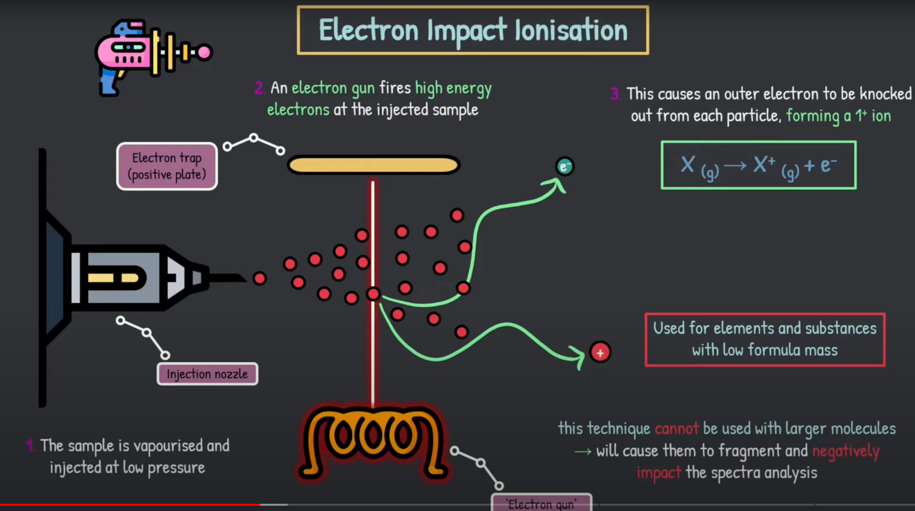this technique cannot be used with larger moleculesas it will cause them to fragment and negatively impact the spectra analysis