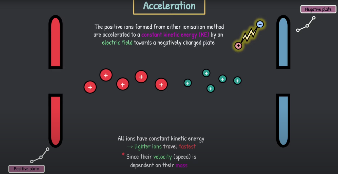 The positive ions formed from either ionisation method are accelerated to a constant kinetic energy (KE) by an electric field towards a negatively charged plate