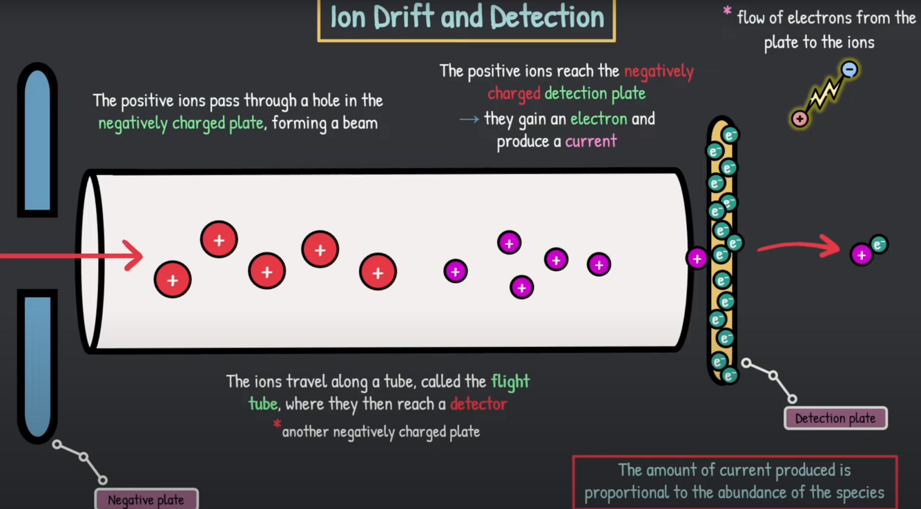 This size of the current is proportional to the abundance of those ions hitting the plate and gaining an electron