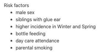 Risks: passive smoking, formula fed, craniofacial abnormalities, attend nursery