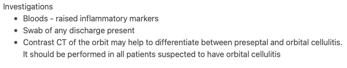 What are some investigations done for diagnosis of pre-septal cellulitis?