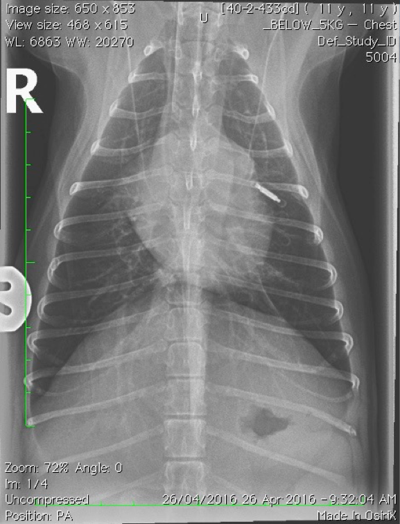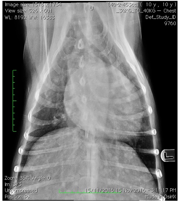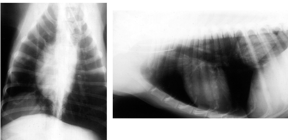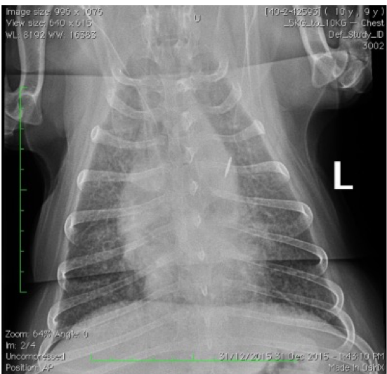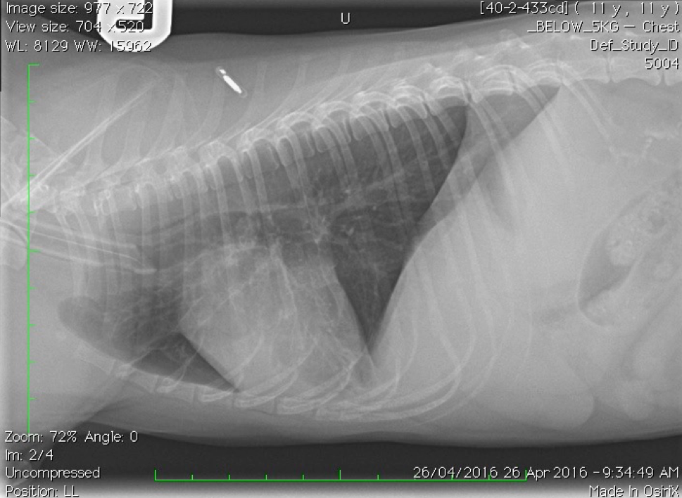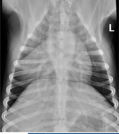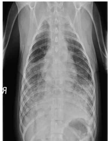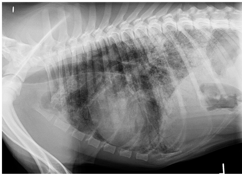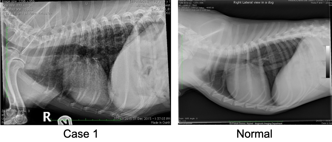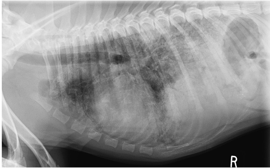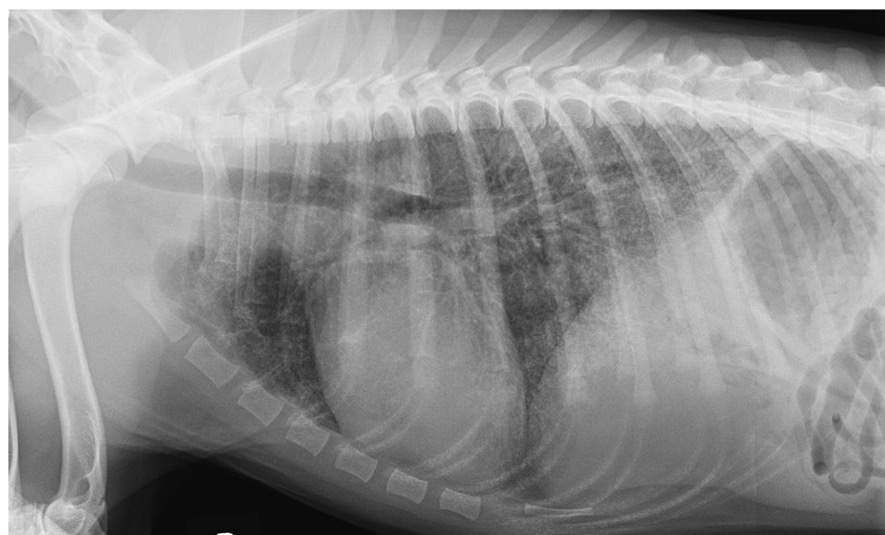 There is generalised greying-out of the lungs but no border obliteration or air bronchograms.