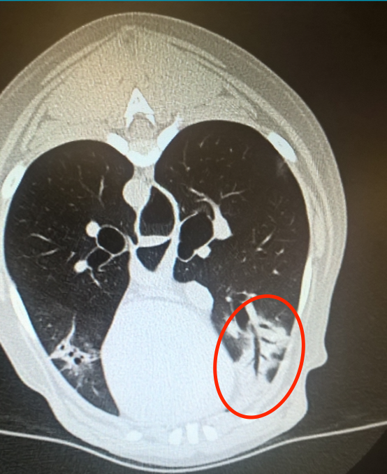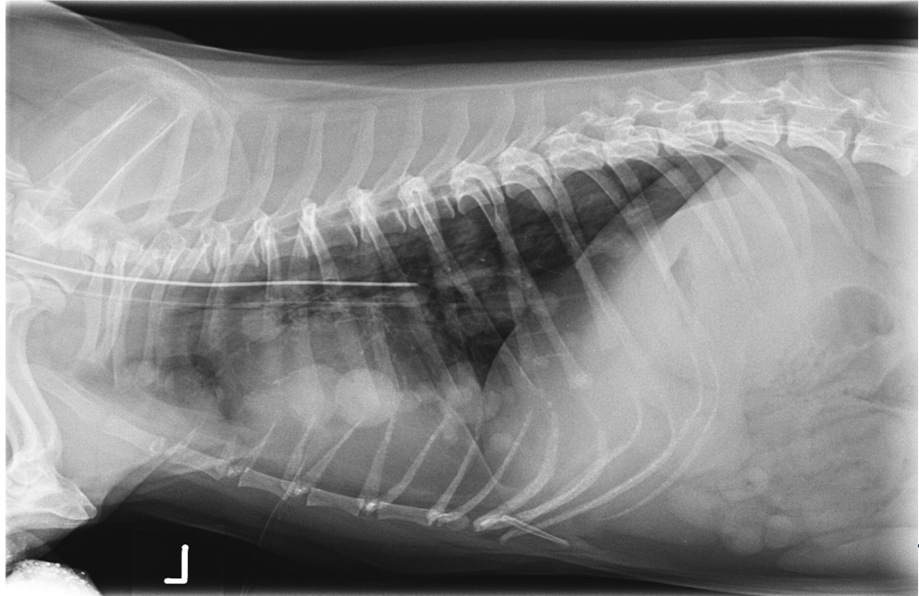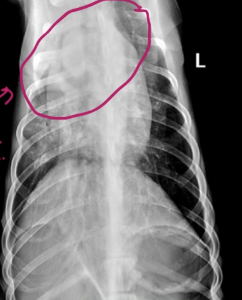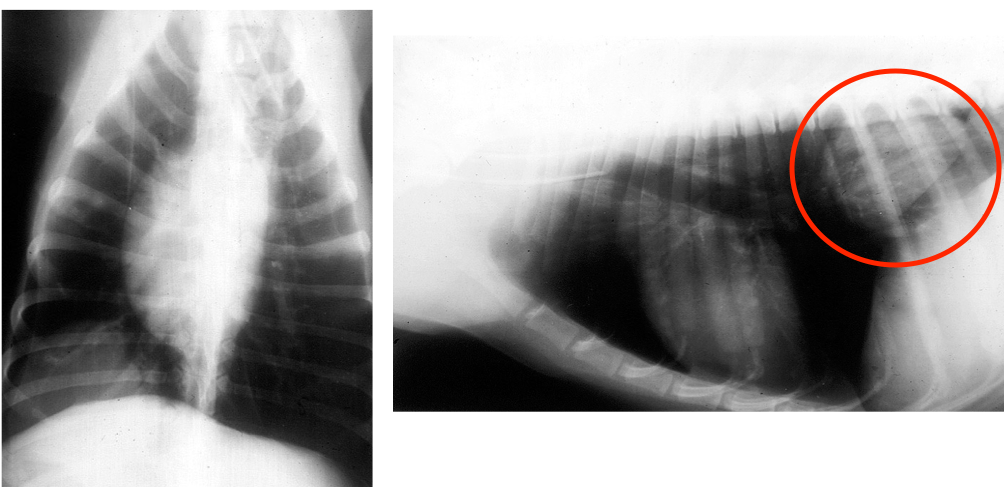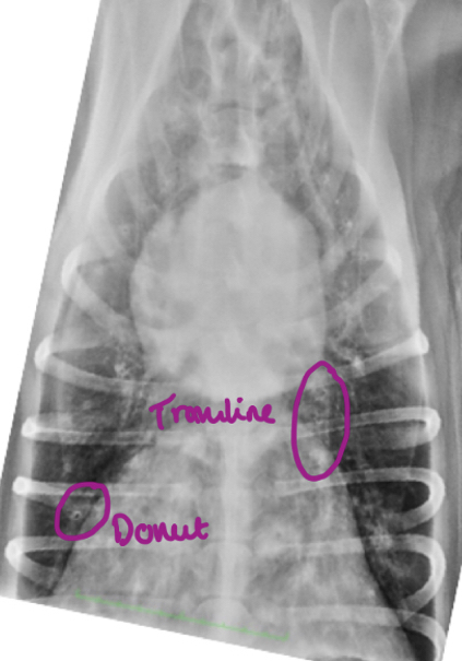 Donut = thickened airway wall. Consistent with bronchial lung pattern. Classic finding in Canine Chronic Bronchitis, for example.
