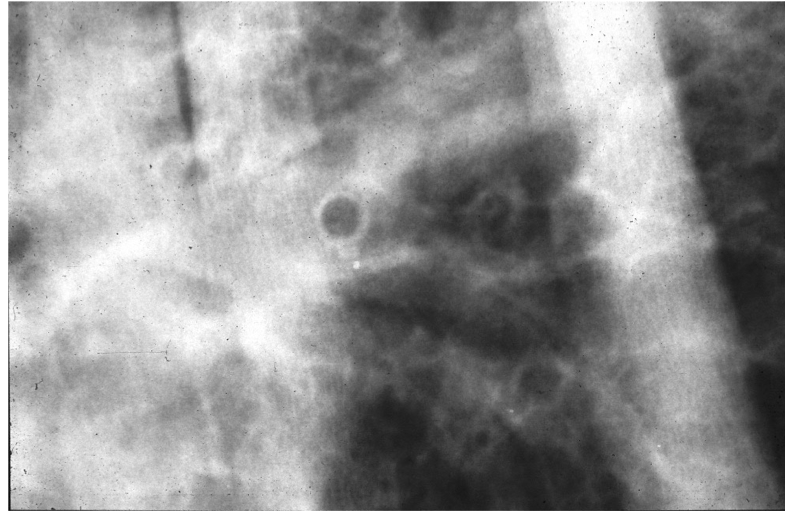Air bronchogram: the phenomenon of air-filled bronchi (dark) being made visible by the opacification of surrounding alveoli.