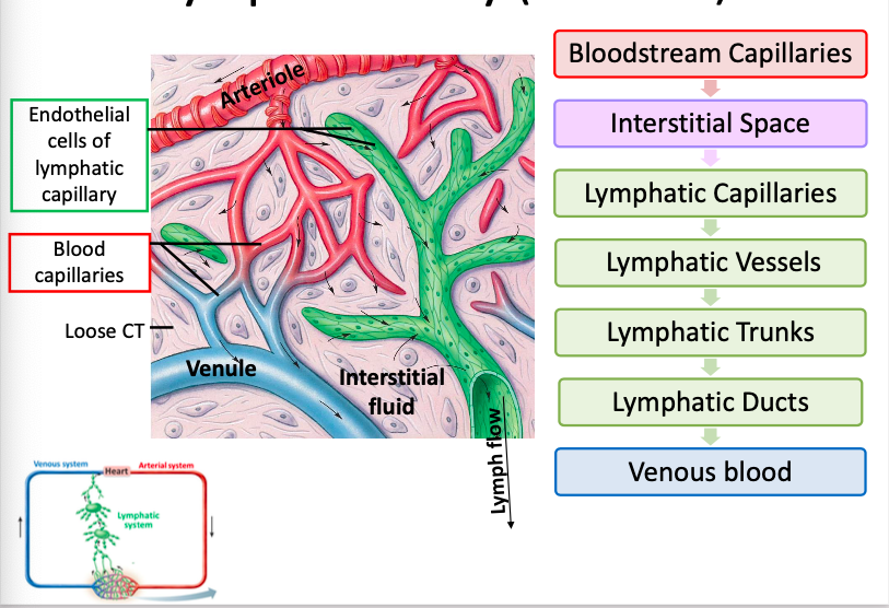 Bloodstream Capillaries -> Interstitual space -> lymphatic capillaries -> lymphatic vessels -> lymphatic trunks -> lymphatic ducs -> venus blood
