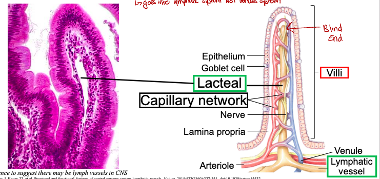 *Absorb digested fat & deliver chyle to bloodstream (goes into lymphatic system not venous sytstem
