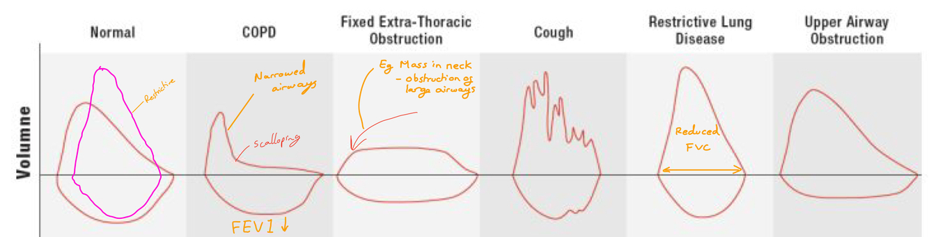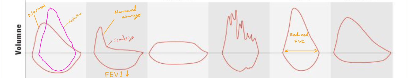 For reference: Flow volume loops with restrictive and obstructive pulmonary diseases.