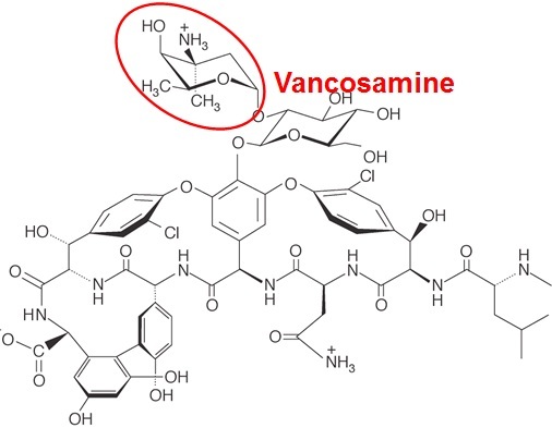 Deglycosylated form is active (termed “aglycone”). Hence, sugars don’t contribute to activity: but the true story is much more complex. Resistance to vancomycin occurs. Modification to vancosamine can overcome it