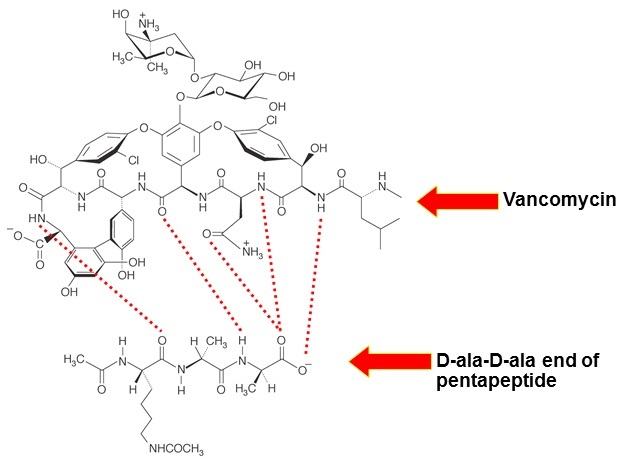 Creates steric interference for enzymes that must recognize this part of the cell wall precursor (“gum on the key”): transpeptidase, transglycosylase. Primary inhibition is at the final amino acid cross-linking step (transpeptidase; like B-lactams)