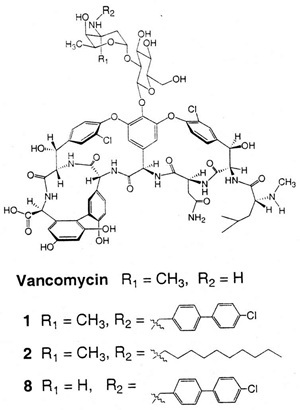 A complex antibiotic isolated from Steptomyces orientalis. Formed of unusual amino acids and sugars hence the name: Glycopeptide. Primarily active against Gram (+) bacteria; most Gram (-) species and mycobacteria are resistant