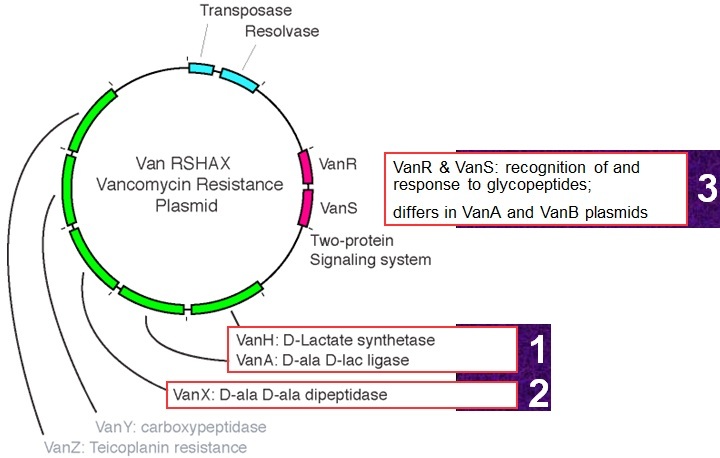 Has new genes: VanH and VanA that make a new tail. VanX cleaves D-ala-D-ala whenever it sees it do stop it from competing with the new tail synthesis