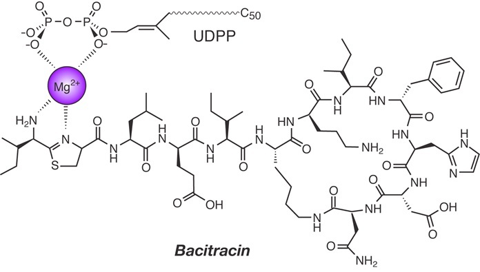 An antibiotic. Formed of 12 amino acids, with 7 in a ring, plus a tail. Bacitracin inhibits cell wall biosynthesis. Primarily active against Gram (+) bacteria. Principally used in topical OTC antibiotic preparations.