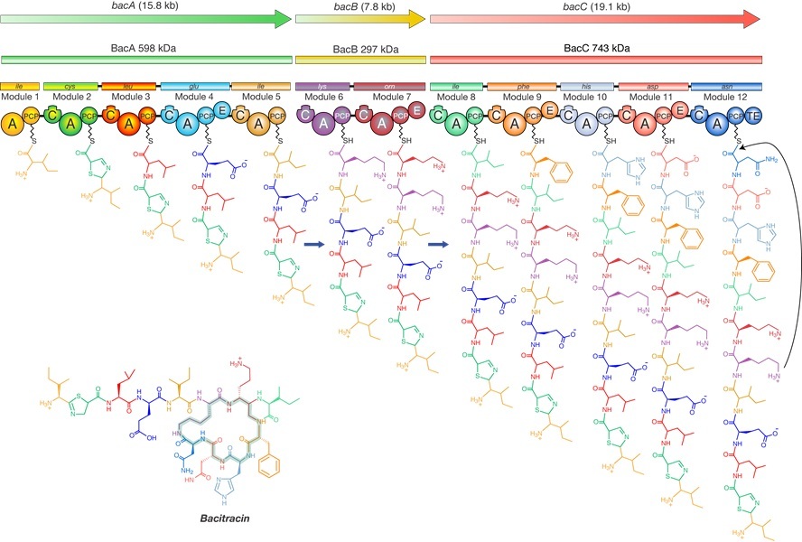 Bacitracin is synthesized by a complex molecular machine called a: Non-Ribosomal Protein Synthetase. Extremely large. 3 domains, each adding a different A.A, going down the line and slowly extending. 3 genes making 3 proteins