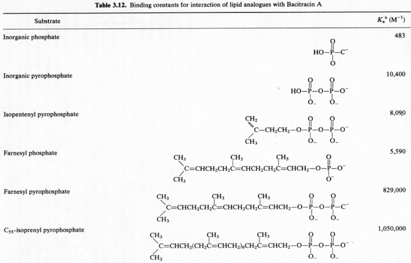 Phosphate cleavage (recycling) requires an enzyme, phosphomonoesterase. However, bacitracin does not affect phosphomonoesterase activity. Rather, bacitracin binds directly to the pyrophosphate end of undecaprenyl-pyrophosphate (it binds to the substrate, not the enzyme. the mechanism is steric interference). Binding is with a 1:1 stoichiometry, and requires both a pyrophosphate and a lipid tail