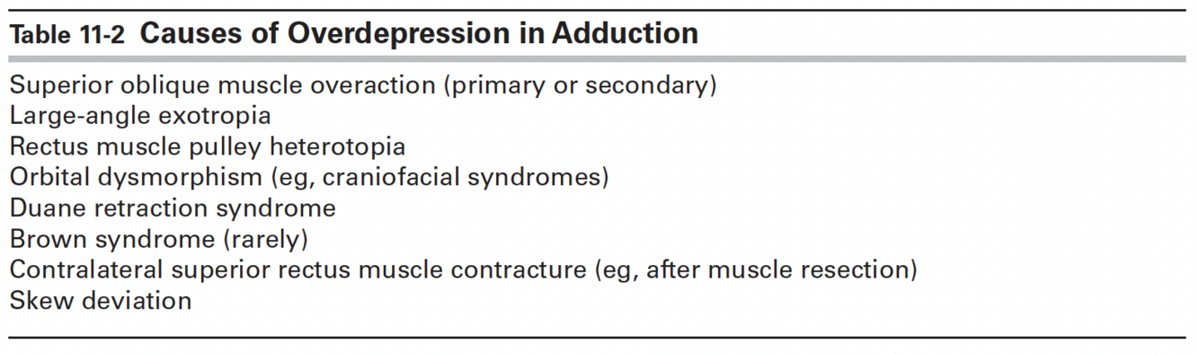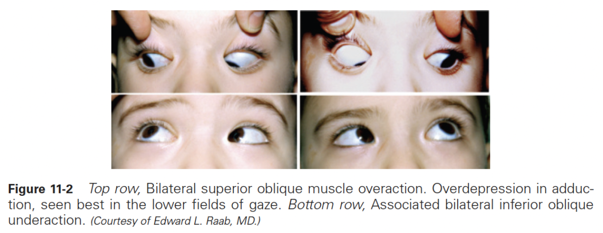 The overacting superior oblique muscle causes a hypotropia of the adducting eye, which is accentuated in the lower field of gaze.