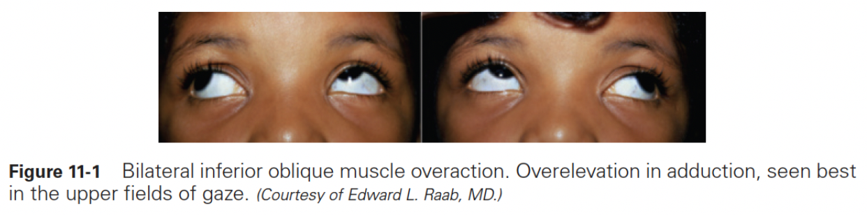 Primary inferior oblique muscle overaction has been reported to develop between ages 1 and 6 years in up to **two- thirds of patients with infantile strabismus (esotropia or exotropia). **