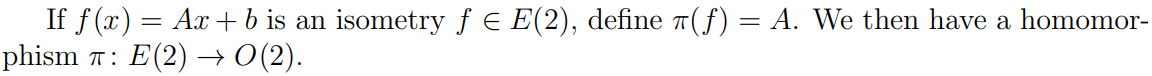 What homomorphism is defined for isometries of the form f(x) =Ax+b in E(2)