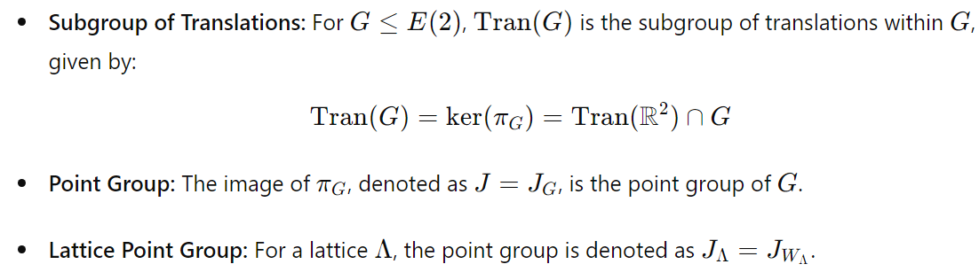 What is the subgroup of translations and the point group of a group G≤E(2)