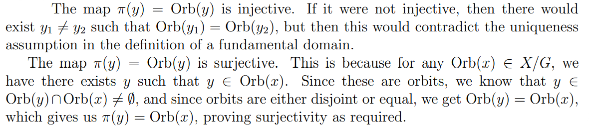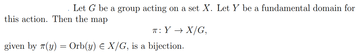Let G be a group acting on a set X. A fundamental domain is a subset Y ⊆ X such that for all x ∈ X there exists a unique y ∈ Y such that y ∈ Orb(x)