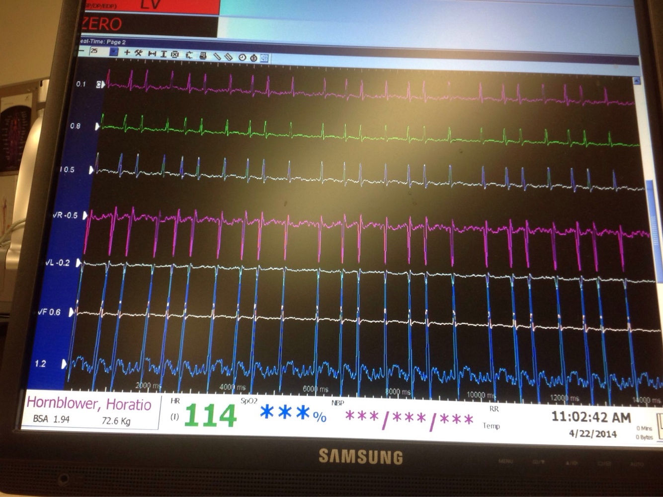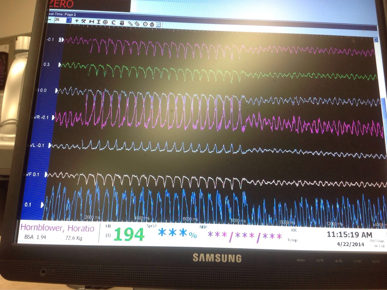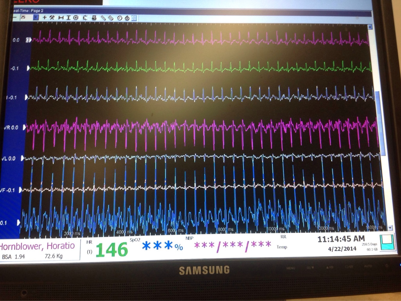 This can occur cannulating a vessel. This is a shockable rhythm.