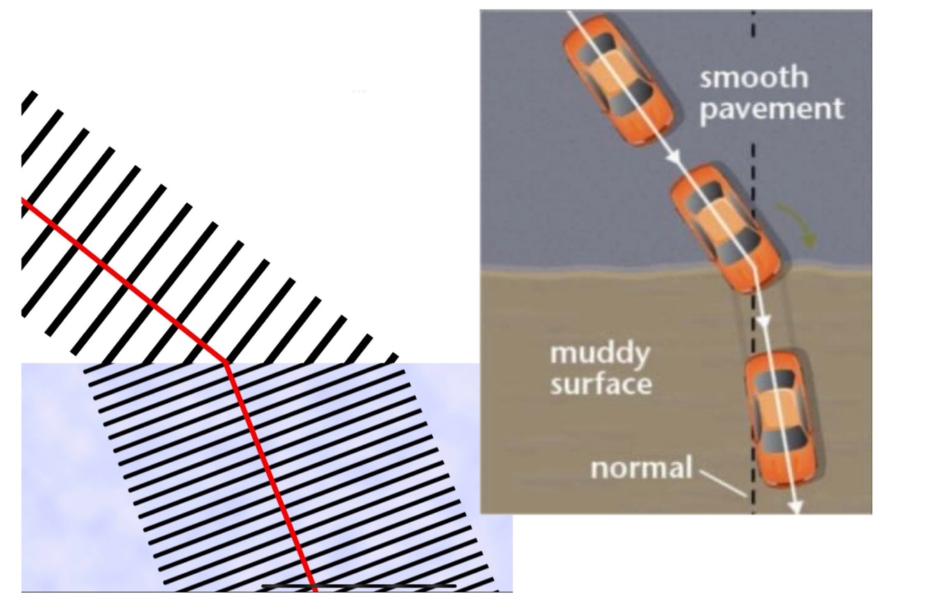 Part of wavefronts change speed first causing the change in direction, when at an angle to the normal