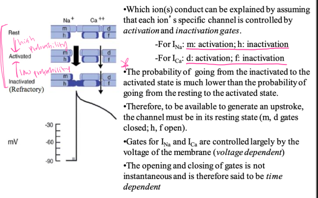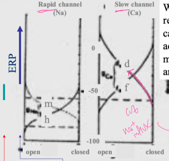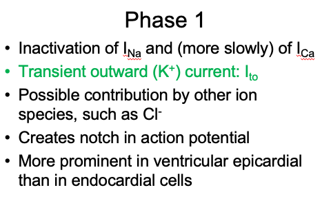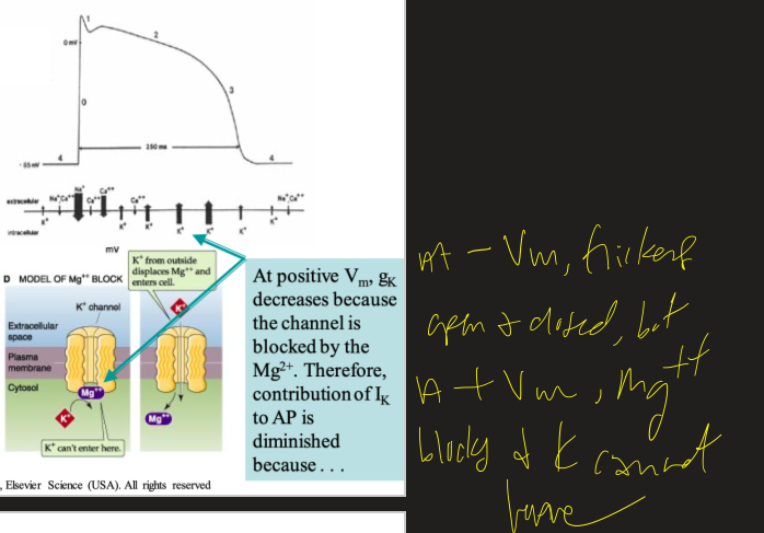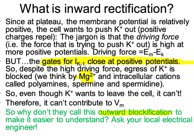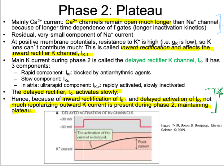 Phase 2 mainly due to (1) Slow inactivation of ICa allows Em to remain positive; (2) K conductances can’t make Em negative early in plateau because IK activates slowly; and (3) IK-1 is inwardly rectifying