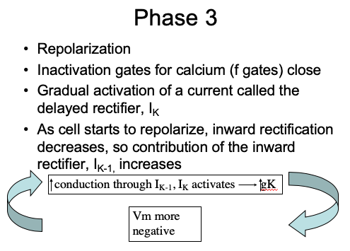Phase 3: ICa inactivates; IK (IKr, IKs) activates in latter phase 2; as Em becomes more negative there is less inward rectification, allowing IK-1 to contribute