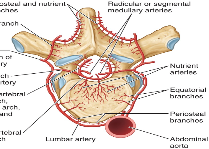 Vertebrae are supplied by periosteal and equatorial branches of the major cervical and segmental arteries and their spinal branches.