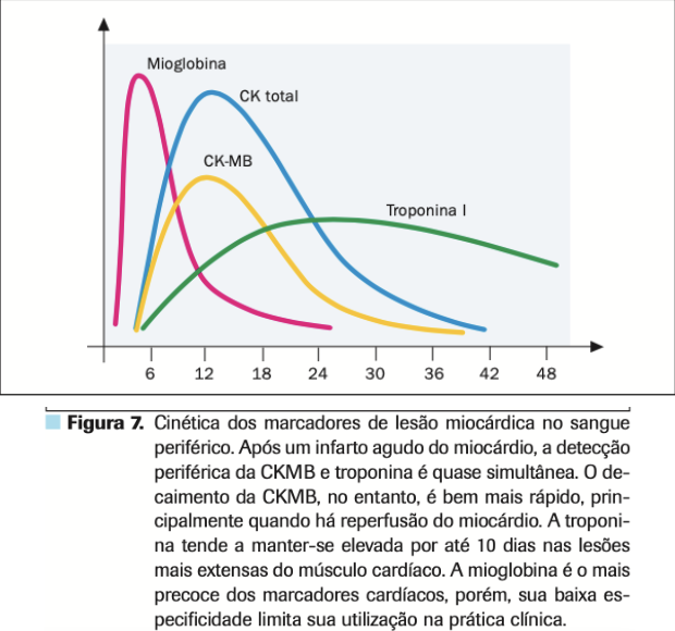 CKMB: Eleva entre 3-4 horas após isquemia, pico em 24-48 horas e normaliza em 72 horas. Usada no diagnóstico de IAM, mas não é totalmente específica, pois também pode ser encontrada em outros tecidos;