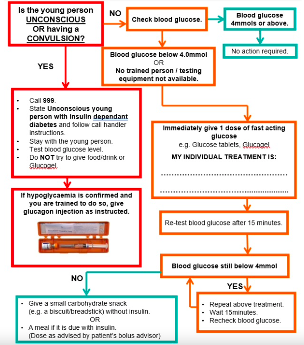 If response give long acting carbohydrate, if no response after 10 minutes ring 999