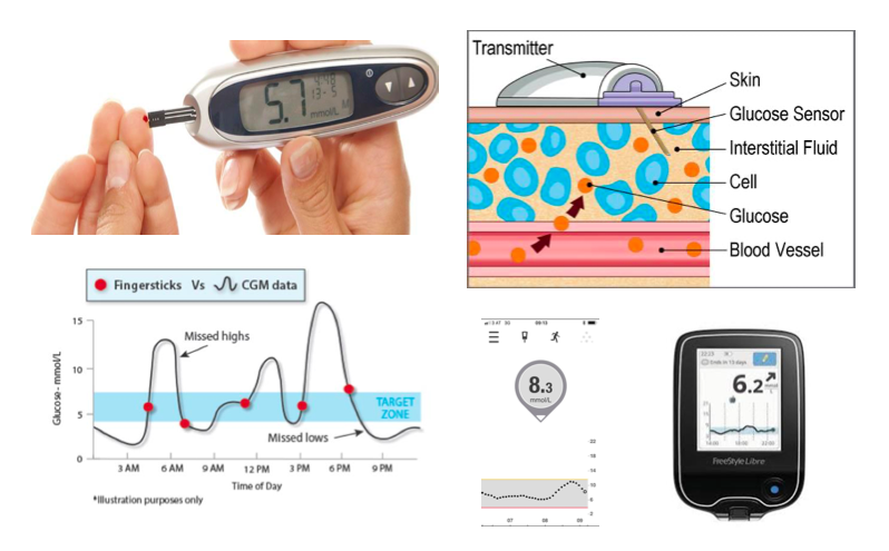 Continuous Glucose Monitoring Sensor: Monitors the glucose levels in the interstitial fluid of the subcutaneous tissue, 5 minute time lag so if feeling hypo need to do capillary blood glucose. Need a new sensor every 2 weeks and need a reader