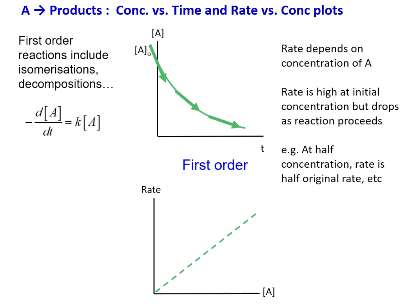 What is the first order plots for conc vs time and rate vs conc