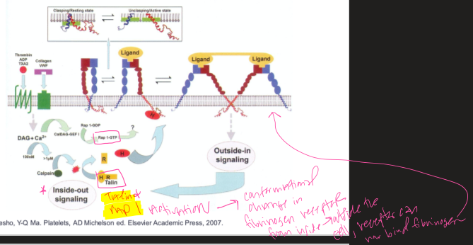 Model showing allosteric activation of platelet integrin receptors (GPIIbIIIa) during platelet activation which promotes platelet binding to fibrinogen and platelet aggregation.