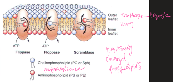 Plasma membrane (pm) transporter-controlled phospholipid exchange by flippase, floppase and scramblase enzymes. Aminophopholipids (PS and PE) are normally transported to the inner cytoplasmic leaflet by flippase, while choline phospholipids are directed to the outer leaflet of the pm by floppase. Scramblase catalyzes the bidirectional phospholipid transport between the two leaflets. Surface exposure of phosphatidylserine in activated platelets occurs by activation of scramblase by calcium influx or during apoptosis of pathological cells. The surface expression of phosphatidylserine provides sites for anchorage of vitamin K-dependant clotting factors in combination with calcium ions.
