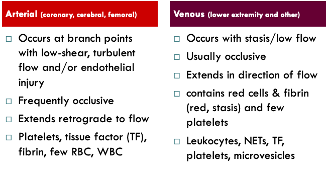 Features of Arterial vs Venous Thrombosis