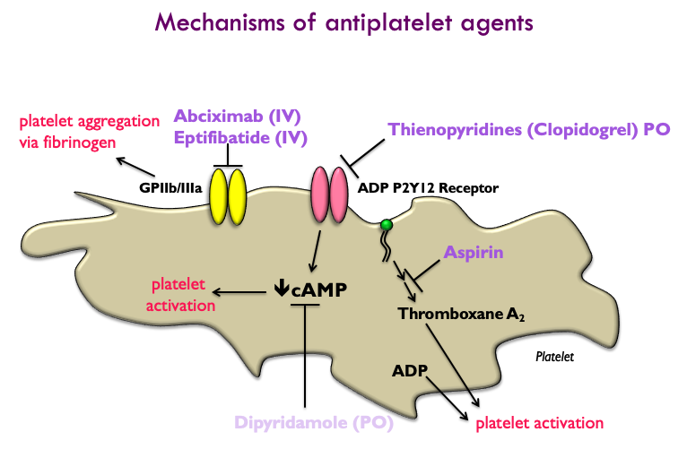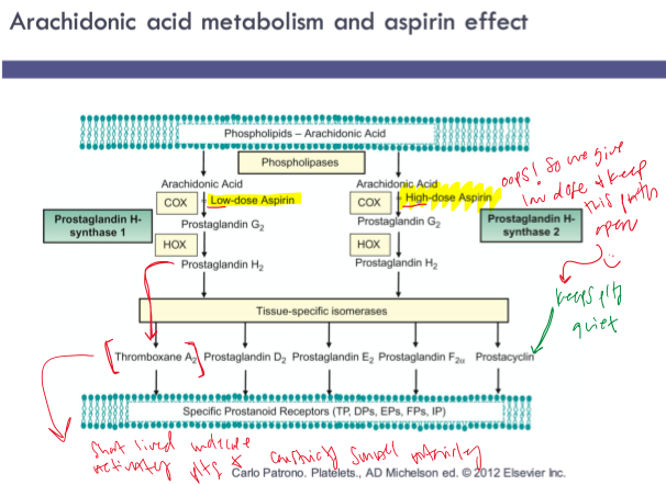 Aspirin (ASA) irreversibly acetylates the cyclo-oxygenase enzyme blocking the production of Thromboxane A2 platelet agonist from arachidonic acid. This pathway is blocked by ASA for the life of the platelet. NSAIDs also block cyclo-oxygenase, however, the effect is reversible and returns to normal after the drug is withdrawn. NSAIDs given close to the time of aspirin may interfere with the inhibitory effect of the latter.