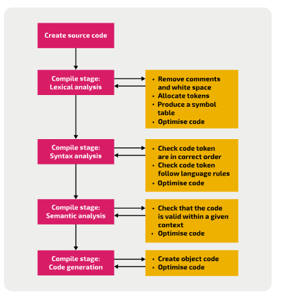 When a compiler is used, high-level code goes through four stages before it is turned into object code that is ready to be executed.