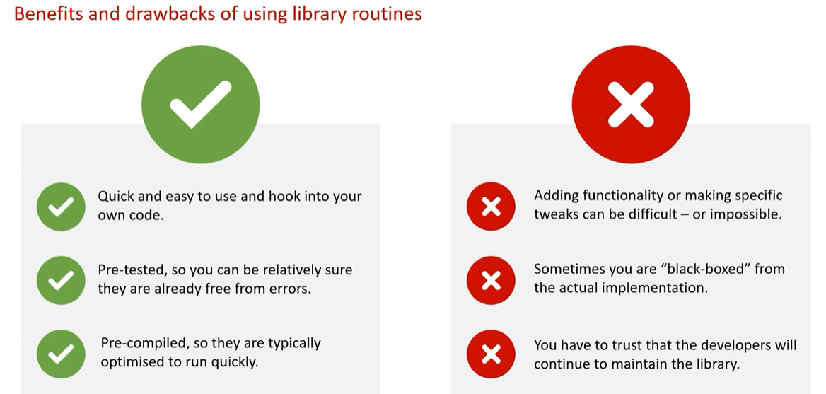 ready compiled and tested programs that can be run when needed. Typically grouped together into software librarians. Most programming languages have extensive libraries of pre-built functions e.g. math library provides common solutions to problems with numbers.