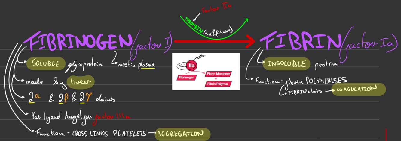 What does fibrinogen become in blood coagulation & explain both substrate & product?