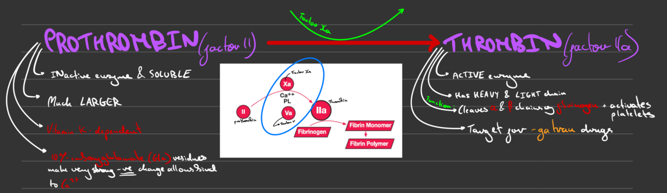 What does prothrombin become in blood coagulation & how? (explain substrate & product)