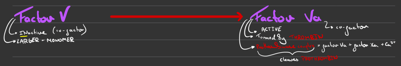 What does factor V become in blood coagulation (& explain substrate & product)?